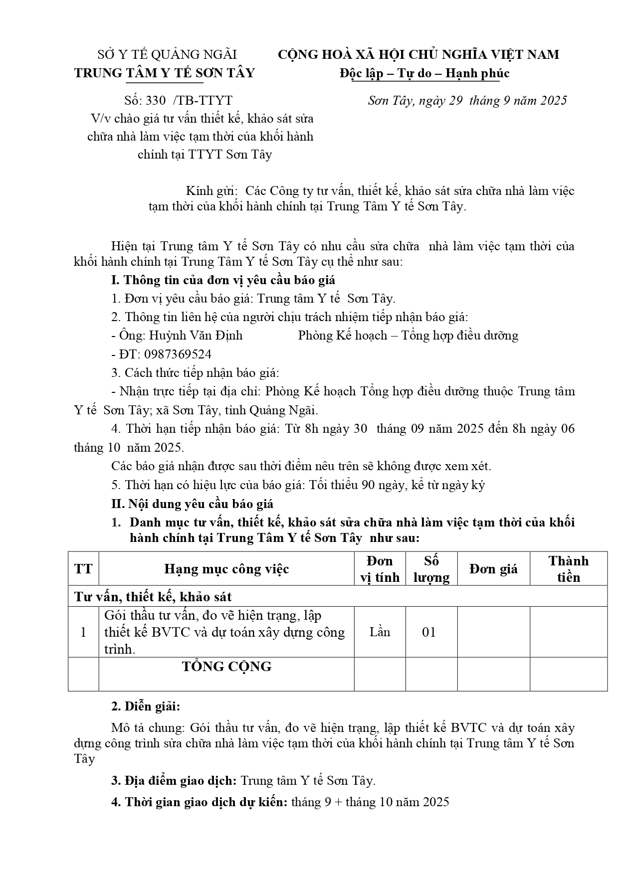 THÔNG BÁO MỜI CHÀO GIÁ TƯ VẤN THIẾT KẾ, KHẢO SÁT SỬA CHỮA NHÀ LÀM VIỆC TẠM THỜI CỦA KHỐI HÀNH CHÍNH TẠI TTYT SƠN TÂY