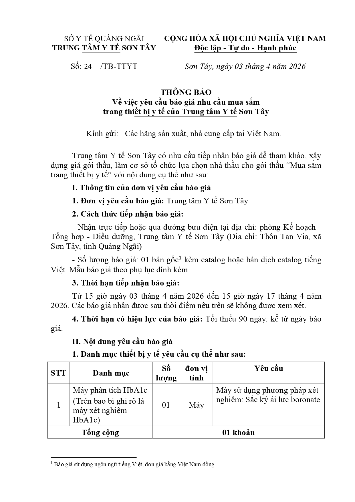 THÔNG BÁO VỀ VIỆC YÊU CẦU BÁO GIÁ NHU CẦU MUA SẮM MÁY PHÂN TÍCH HBA1C (MÁY XÉT NGHIỆM HBA1C) CỦA TRUNG TÂM Y TẾ SƠN TÂY