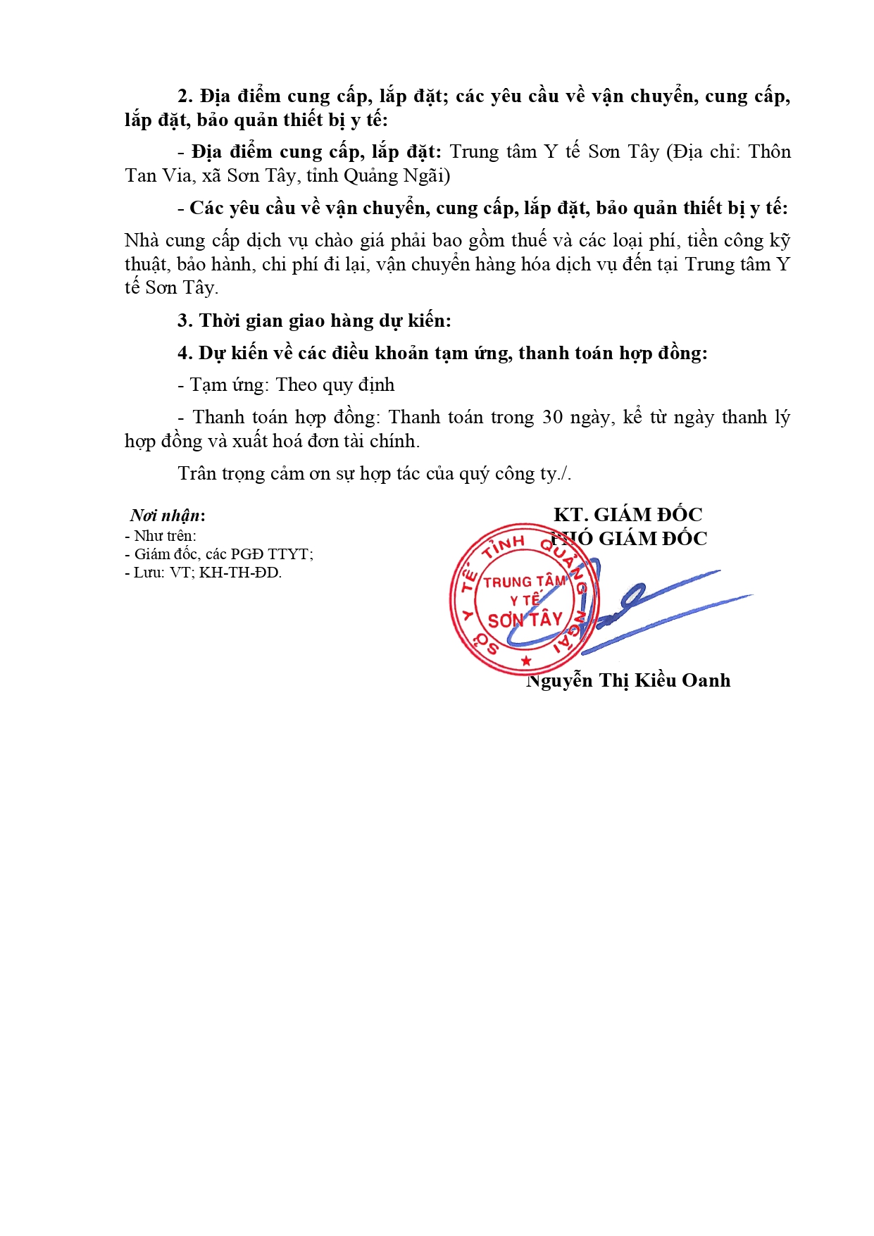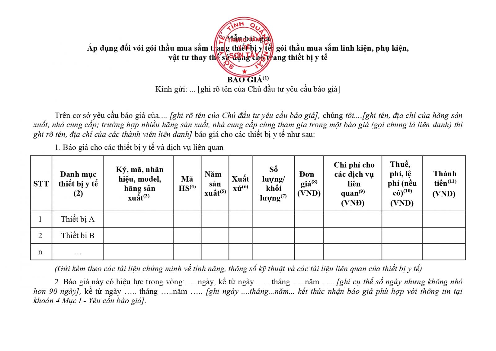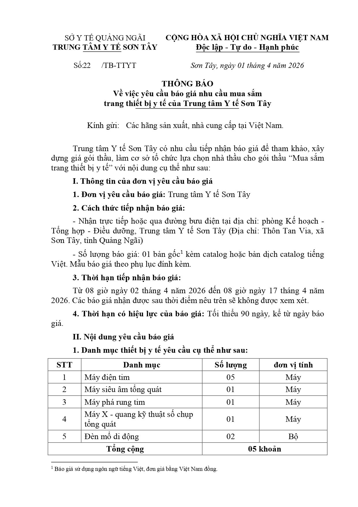 THÔNG BÁO VỀ VIỆC YÊU CẦU BÁO GIÁ NHU CẦU MUA SẮM TRANG THIẾT BỊ Y TẾ CỦA TRUNG TÂM Y TẾ SƠN TÂY