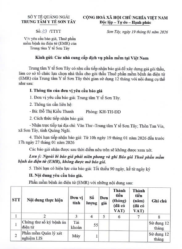 V/v yêu cầu báo giá, Thuê phần mềm quản lý bệnh viện (Phần mềm His) năm 2026 của Trung tâm Y tế Sơn Tây
