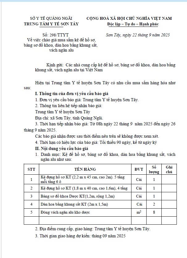 Về việc chào giá mua sắm kệ để hồ sơ, bảng sơ đồ khoa, dàn hoa bằng khung sắt, vách ngăn alu Ngày đăng: 22/09/2025 - 14:44 Tải Thông báo Tại đây Chia sẻ: | In bài viết